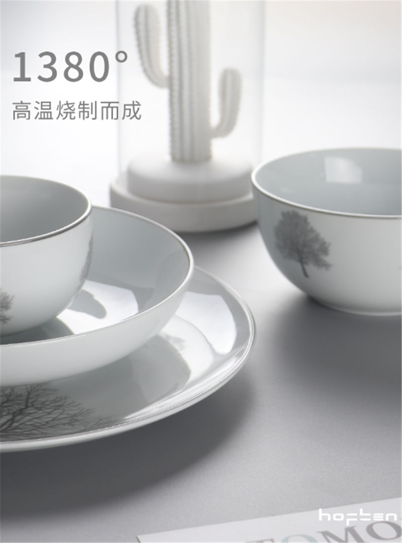 HOFTEN赫芬家居的北欧简约冰岛套装,整体采用奶白配色,搭配简约 域丛林图案与金边线条,通过1380度高温煅烧,令色彩绽放鲜活之美。印花工艺与手绘工艺的完美融合,清新别致的树木之林感受别样的冰岛之风。
